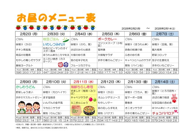 ◇お昼のメニュー表◇2/2~2/142026.1.24