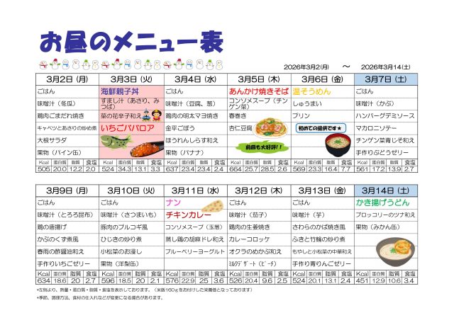 3月3日ひなまつりの日は、鮭ごはんにいくらをたっぷり乗せた海鮮親子丼です♪ 追加利用ご希望の方は、お気軽に職員までお声かけください! 3月5日のあんかけ焼きそばも、前回好評だったメニューです☆